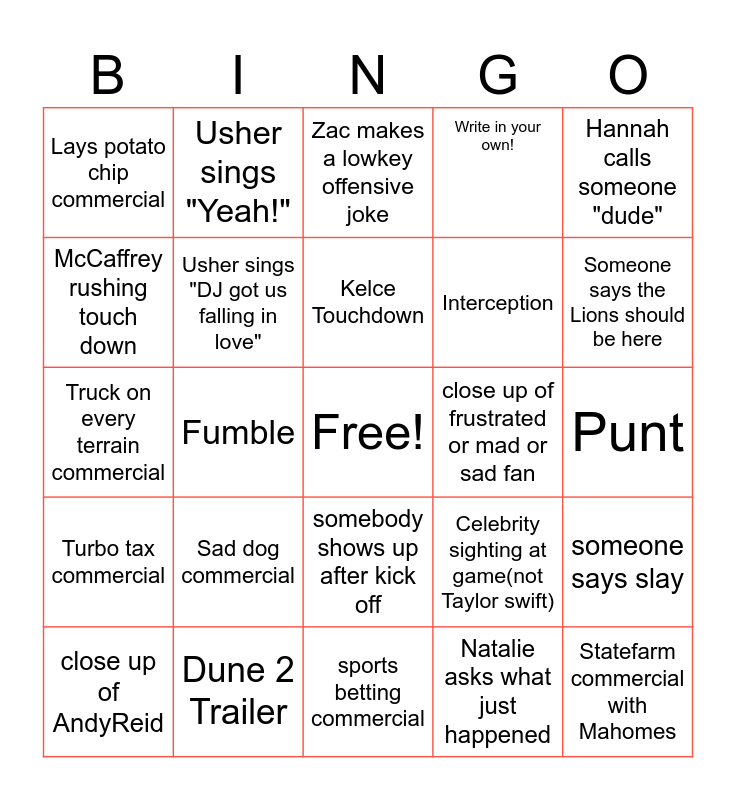 This bingo card has a free space and 42 words: Taylor Swift sighting, Kelce Touchdown, Someone shouts at the TV, Sad dog commercial, Natalie asks what just happened, someone says slay, Statefarm commercial with Mahomes, Jason Kelce sighting, Zac makes a lowkey offensive joke, somebody shows up after kick off, Punt, Someone says the Lions should be here, Fumble, Hannah calls someone "dude", Doritos commercial, Celebrity sighting at game(not Taylor swift), Beer ad featuring Post Malone, Truck on every terrain commercial, Over 47.5 points total, Usher sings "Yeah!", McCaffrey rushing touch down, 2024 Olympics commercial, Jake Moody makes a field goal, Lays potato chip commercial, Cardi B in commercial, Grace brings Zevia root beer, Interception, Local lawyer commercial, end zone celebration dance, Door Dash Commercial, Uber eats commercial, Turbo tax commercial, Usher sings "DJ got us falling in love", sports betting commercial, Celebrity sighting at game(not Taylor swift), close up of AndyReid, Dune 2 Trailer, close up of frustrated or mad or sad fan, Chris jones sack, field goal of more than 45 yards, Write in your own! and Write in your own!.