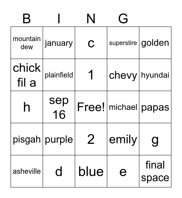 This bingo card has a free space and 39 words: the bahamas, pigeon, august, plainfield, asheville, 2, 1, 2019, golden, pisgah, sep 16, superstire, final space, papas, michael, purple, okie dokies, mountain dew, strognoff, emily, chick fil a, blue, chevy, hyundai, salmon, blaze, SAUSAGE, 4, june, january, a, b, c, d, e, f, g, h and i.