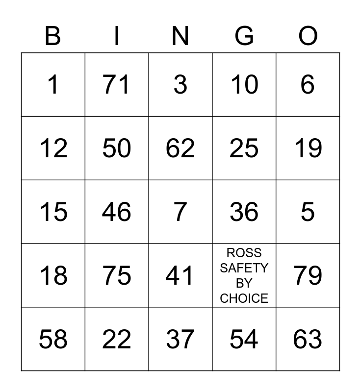 This bingo card has 25 words: 75, 37, 62, 58, 6, 1, 12, 71, 36, 41, 25, 15, ROSS SAFETY BY CHOICE, 79, 50, 63, 5, 3, 19, 46, 7, 22, 18, 10 and 54.