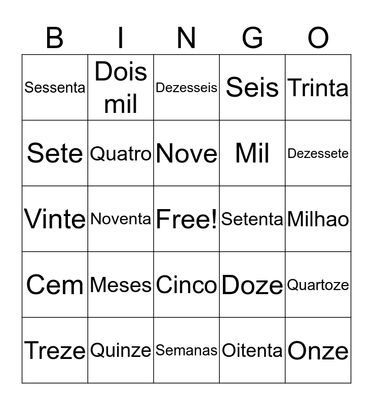This bingo card has a free space and 35 words: Um, Dois, Tres, Quatro, Cinco, Seis, Sete, Oito, Nove, Dez, Vinte, Trinta, Quarenta, Cinquenta, Sessenta, Setenta, Oitenta, Noventa, Cem, Onze, Doze, Treze, Quartoze, Quinze, Dezesseis, Dezessete, Dezoito, Dezenove, Mil, Milhao, Dias, Semanas, Meses, Dois mil and Cento e vinte.