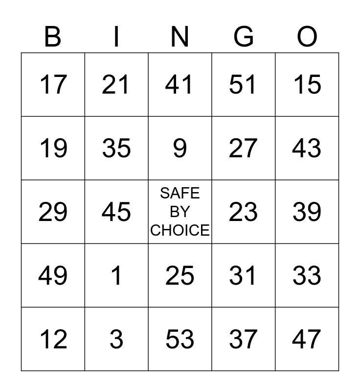 This bingo card has a free space and 24 words: 1, 3, 9, 12, 15, 17, 19, 21, 23, 25, 27, 29, 31, 33, 35, 37, 39, 41, 43, 45, 47, 49, 51 and 53.