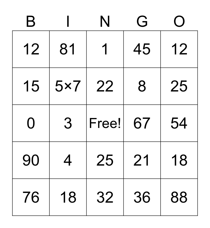 This bingo card has a free space and 26 words: 25, 36, 22, 18, 12, 12, 15, 81, 54, 21, 8, 0, 18, 76, 3, 5, 45, 90, 1, 88, 25, 32, 67, 4, 5×7 and 6×6.