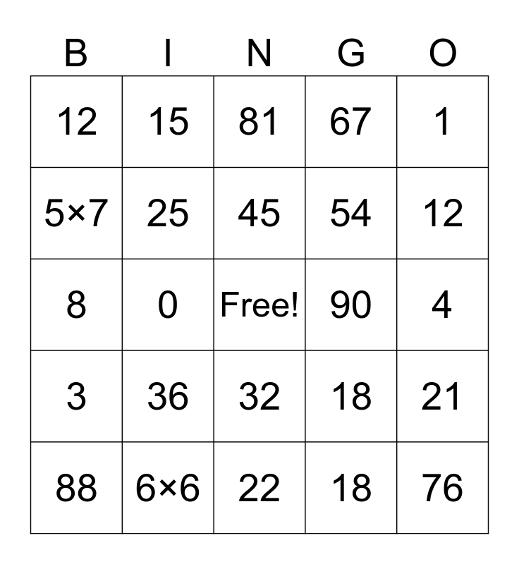 This bingo card has a free space and 26 words: 25, 36, 22, 18, 12, 12, 15, 81, 54, 21, 8, 0, 18, 76, 3, 5, 45, 90, 1, 88, 25, 32, 67, 4, 5×7 and 6×6.