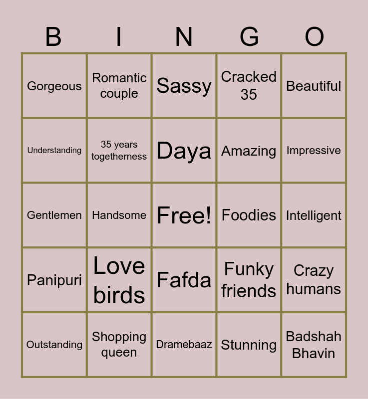 This bingo card has a free space and 49 words: Laila Leena, Badshah Bhavin, Nautanki, Dramebaaz, Love birds, Laila majnu, Romantic couple, Tom & Jerry, Understanding, Couple goals, 35 years togetherness, Cracked 35, Crazy humans, Funky friends, Quirky Leena, Jethalal, Daya, Foodies, Chef Bhavin, Beautiful, Handsome, Stunning, Gorgeous, Amazing, Fantastic, Impressive, Outstanding, Jalebi, Fafda, Panipuri, Locho, Chatpapdi, Dosa, Sundari, Shopping queen, Soulmates, Supportive, Funny bhavin, Intelligent, Generous, Strong, Passionate, Admirable, Talented, Gentlemen, Sassy, Forever, Best hubby and Best wifey.