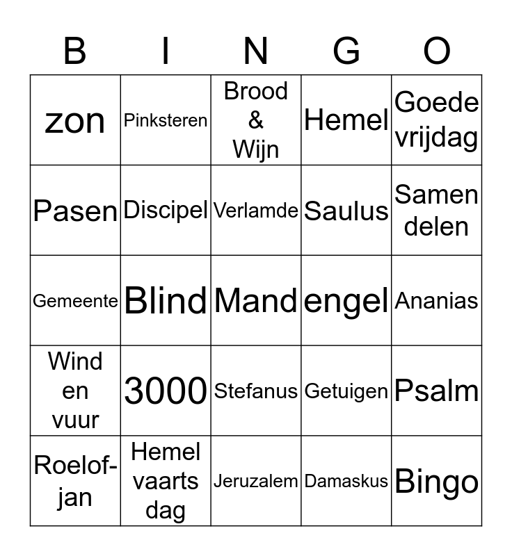 This bingo card has a free space and 24 words: 3000, Hemel vaarts dag, Verlamde, Roelof-jan, Goede vrijdag, zon, Pasen, Pinksteren, engel, Stefanus, Saulus, Gemeente, Getuigen, Psalm, Discipel, Damaskus, Ananias, Brood & Wijn, Samen delen, Blind, Bingo, Wind en vuur, Hemel and Jeruzalem.