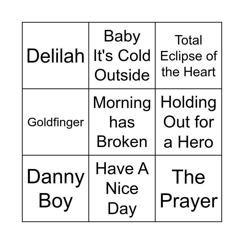 This bingo card has 17 words: It's not unusual, Diamonds are forever, Total Eclipse of the Heart, Delilah, Welsh National Anthem, Goldfinger, Without You, Danny Boy, Have A Nice Day, Holding Out for a Hero, Hey Big Spender, Crazy Chick, Morning has Broken, Baby It's Cold Outside, The Prayer, Walking in the Air and Don't Cry for Me Argentina.
