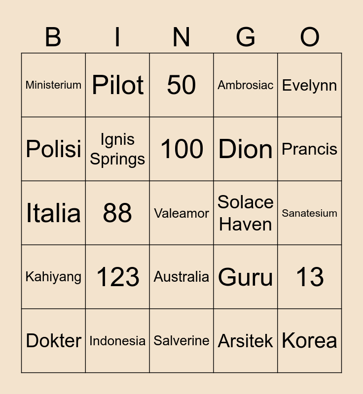 This bingo card has a free space and 24 words: 123, Indonesia, 100, Dokter, Evelynn, Ministerium, Polisi, Pilot, Solace Haven, Australia, Dion, Italia, Guru, 13, Ignis Springs, Arsitek, Sanatesium, 50, Prancis, 88, Korea, Kahiyang, Ambrosiac and Salverine.