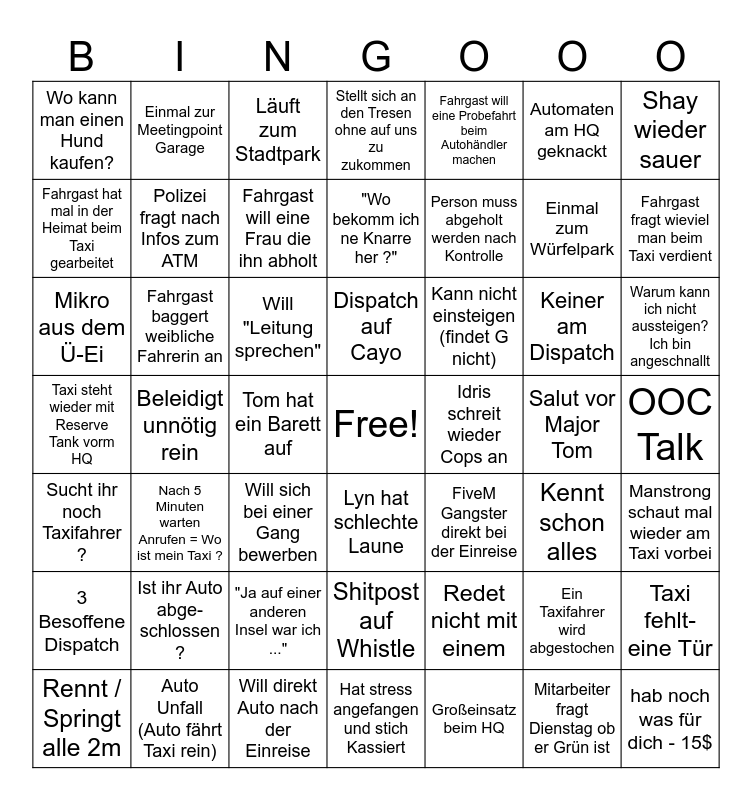 This bingo card has a free space and 48 words: Redet nicht mit einem, Einmal zum Würfelpark, Hat stress angefangen und stich Kassiert, Beleidigt unnötig rein, Will "Leitung sprechen", OOC Talk, Einmal zur Meetingpoint Garage, Auto Unfall (Auto fährt Taxi rein), Automaten am HQ geknackt, Lyn hat schlechte Laune, Shay wieder sauer, Stellt sich an den Tresen ohne auf uns zu zukommen, Keiner am Dispatch, Kann nicht einsteigen (findet G nicht), 3 Besoffene Dispatch, Salut vor Major Tom, Fahrgast hat mal in der Heimat beim Taxi gearbeitet, Fahrgast fragt wieviel man beim Taxi verdient, Ein Taxifahrer wird abgestochen, Fahrgast will eine Probefahrt beim Autohändler machen, Person muss abgeholt werden nach Kontrolle, Tom hat ein Barett auf, Wo kann man einen Hund kaufen?, Polizei fragt nach Infos zum ATM, Taxi fehlt-eine Tür, Fahrgast will eine Frau die ihn abholt, Warum kann ich nicht aussteigen? Ich bin angeschnallt, Rennt / Springt alle 2m, Dispatch auf Cayo, Fahrgast baggert weibliche Fahrerin an, Mitarbeiter fragt Dienstag ob er Grün ist, Idris schreit wieder Cops an, Manstrong schaut mal wieder am Taxi vorbei, Ist ihr Auto abge-schlossen ?, Taxi steht wieder mit Reserve Tank vorm HQ, FiveM Gangster direkt bei der Einreise, Kennt schon alles, Mikro aus dem Ü-Ei, Will sich bei einer Gang bewerben, "Ja auf einer anderen Insel war ich ...", Sucht ihr noch Taxifahrer ?, hab noch was für dich - 15$, Läuft zum Stadtpark, Will direkt Auto nach der Einreise, "Wo bekomm ich ne Knarre her ?", Shitpost auf Whistle, Nach 5 Minuten warten Anrufen = Wo ist mein Taxi ? and Großeinsatz beim HQ.