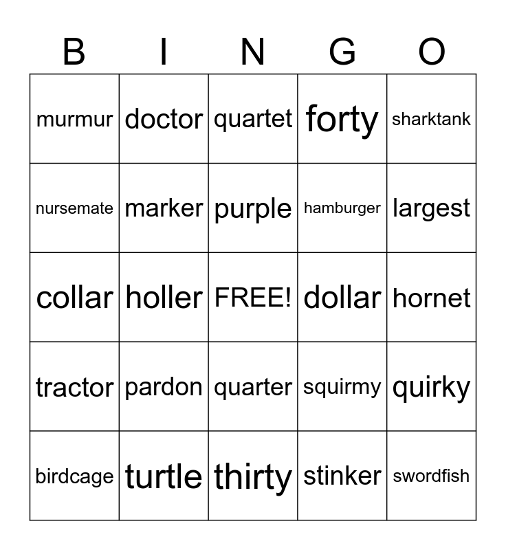This bingo card has a free space and 24 words: pardon, turtle, purple, birdcage, sharktank, murmur, nursemate, doctor, dollar, quarter, hamburger, collar, squirmy, quirky, marker, stinker, hornet, quartet, largest, holler, swordfish, tractor, forty and thirty.