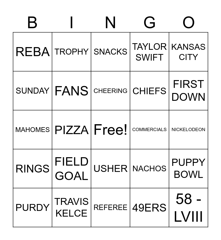 This bingo card has a free space and 28 words: PUPPY BOWL, FOOTBALL, CHIEFS, 49ERS, SUNDAY, SNACKS, TROPHY, RINGS, COMMERCIALS, PURDY, MAHOMES, TAYLOR SWIFT, TRAVIS KELCE, REFEREE, FIRST DOWN, TOUCHDOWN, FIELD GOAL, FANS, CHEERING, USHER, REBA, LAS VEGAS, 58 - LVIII, PIZZA, NICKELODEON, NACHOS, KANSAS CITY and SAN FRANCISCO.