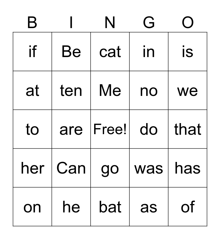 This bingo card has a free space and 25 words: Can, bat, Me, on, is, if, at, Be, do, go, no, to, was, has, ten, them, that, cat, we, are, of, he, her, in and as.