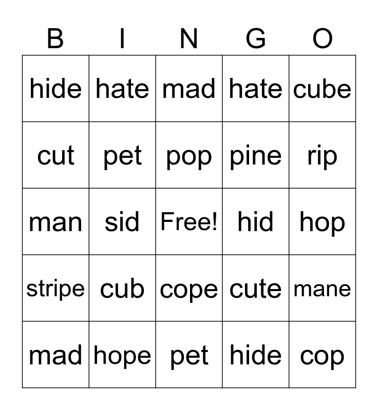 This bingo card has a free space and 54 words: hat, stripe, here, made, cope, Pete, hate, pin, cut, mane, hide, cub, hope, mad, her, pet, cop, pine, strip, hop, cute, man, hid, cube, hat, hate, cap, cape, hid, hide, cop, cope, cut, cute, mad, made, man, mane, Pete, pet, strip, stripe, pin, pine, cub, cube, hop, hope, pop, sid, rip, side, ripe and poe.