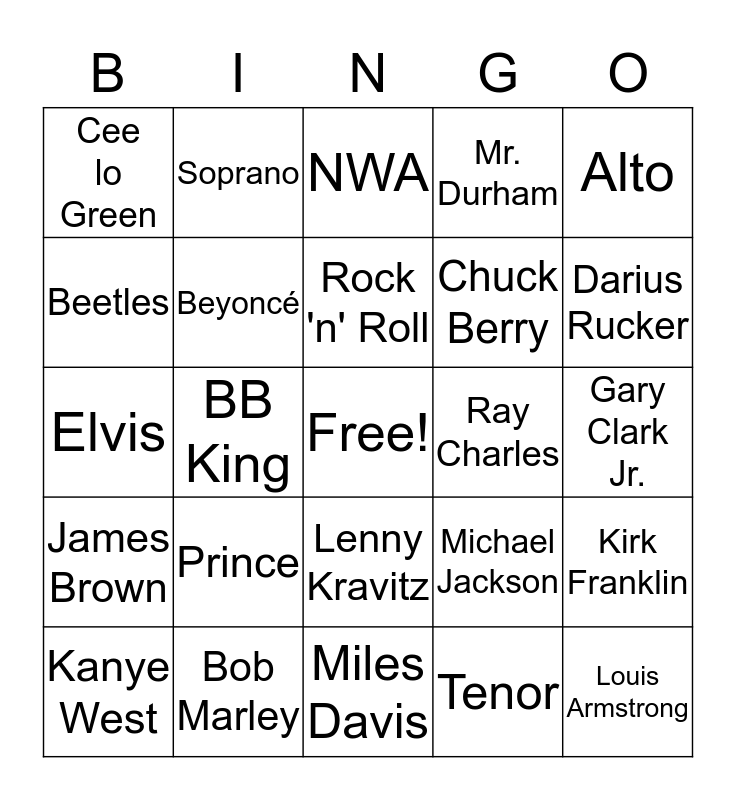 This bingo card has a free space and 24 words: Prince, Bob Marley, Rock 'n' Roll, Kanye West, Alto, Cee lo Green, Beetles, Soprano, Ray Charles, Lenny Kravitz, Chuck Berry, Elvis, Michael Jackson, Kirk Franklin, Beyoncé, Tenor, Gary Clark Jr., NWA, Darius Rucker, BB King, Louis Armstrong, James Brown, Mr. Durham and Miles Davis.