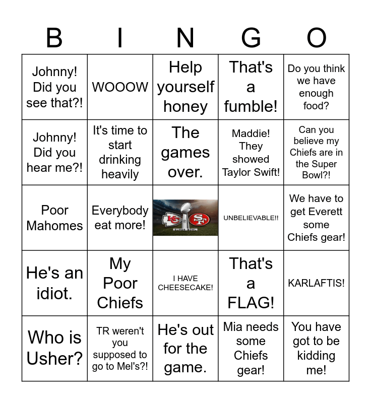 This bingo card has a free space and 24 words: My Poor Chiefs, TR weren't you supposed to go to Mel's?!, The games over., Who is Usher?, Do you think we have enough food?, Johnny! Did you see that?!, Johnny! Did you hear me?!, WOOOW, UNBELIEVABLE!!, I HAVE CHEESECAKE!, Maddie! They showed Taylor Swift!, Poor Mahomes, That's a FLAG!, KARLAFTIS!, It's time to start drinking heavily, Mia needs some Chiefs gear!, We have to get Everett some Chiefs gear!, Help yourself honey, Can you believe my Chiefs are in the Super Bowl?!, Everybody eat more!, You have got to be kidding me!, He's an idiot., That's a fumble! and He's out for the game..