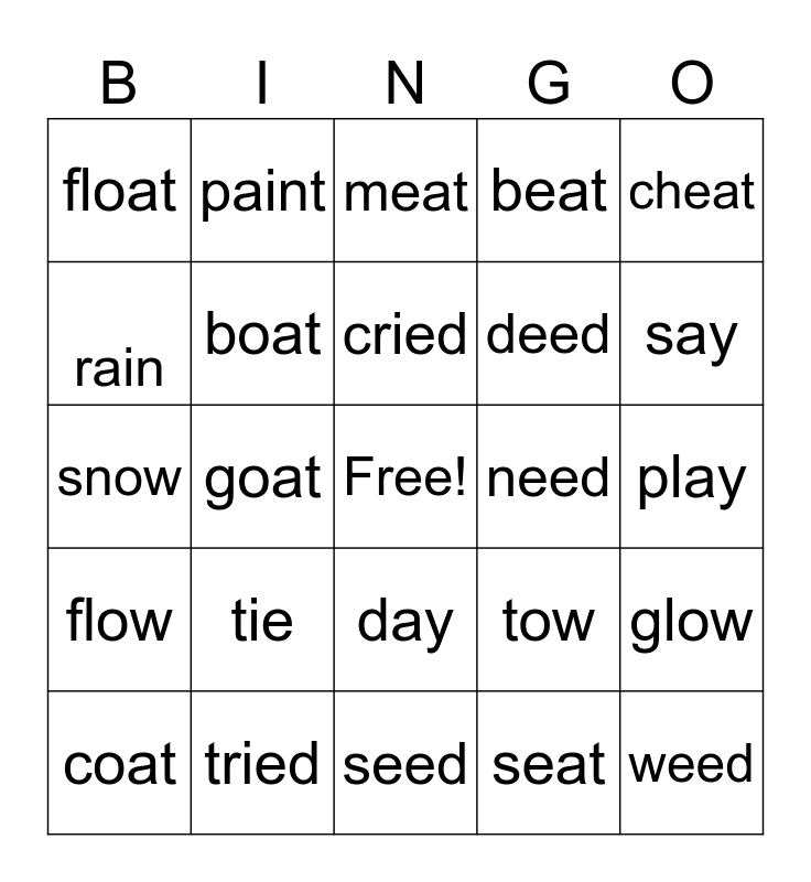This bingo card has a free space and 24 words: tie, tried, cried, coat, cheat, float, rain, paint, need, day, deed, snow, tow, glow, boat, seat, play, meat, say, goat, weed, flow, beat and seed.