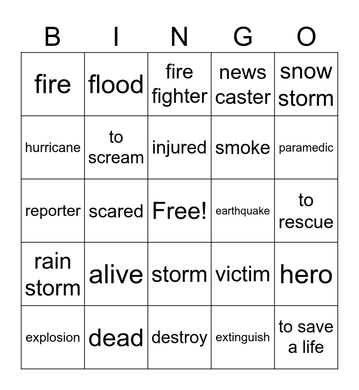 This bingo card has a free space and 24 words: alive, dead, injured, explosion, snow storm, fire, hurricane, flood, earthquake, storm, smoke, reporter, victim, hero, to scream, extinguish, to rescue, fire fighter, paramedic, scared, to save a life, rain storm, news caster and destroy.