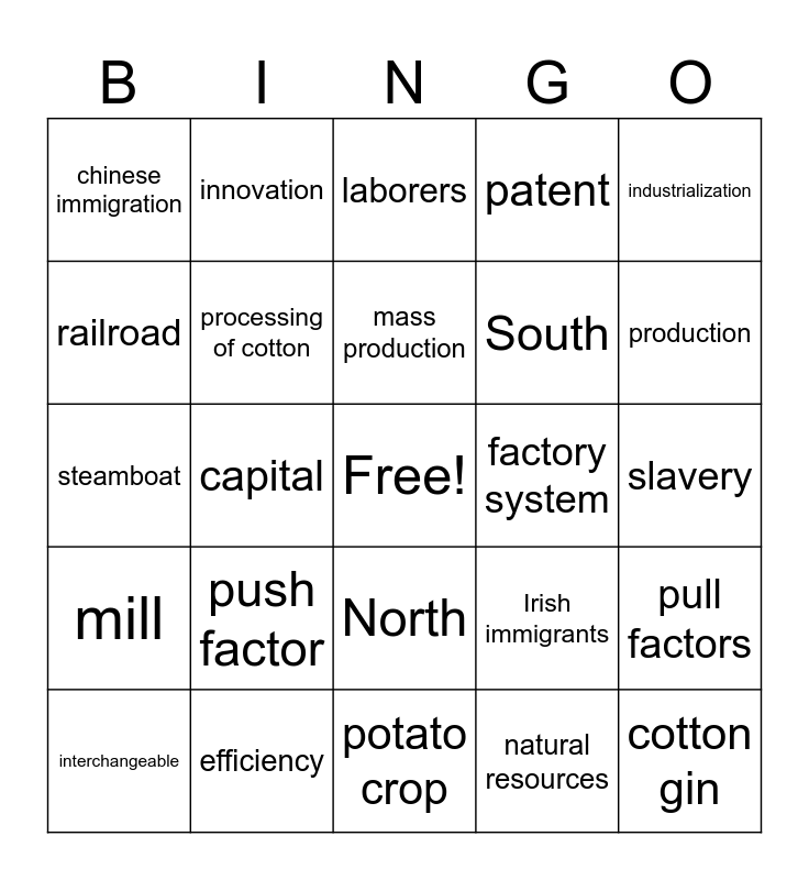 This bingo card has a free space and 24 words: push factor, efficiency, mass production, interchangeable, industrialization, chinese immigration, railroad, innovation, factory system, North, South, steamboat, Irish immigrants, pull factors, processing of cotton, natural resources, slavery, laborers, production, capital, cotton gin, mill, patent and potato crop.