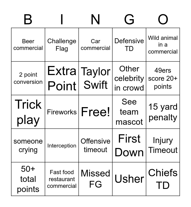 This bingo card has a free space and 52 words: 49ers TD, Chiefs TD, Made FG, Missed FG, Interception, Fumble, Challenge Flag, 49ers Penalty, 2 point conversion, Chiefs Penalty, Extra Point, False Start Penalty, Injury Timeout, First Down, Punt, 4th down conversion, Taylor Swift, See team mascot, Candy commercial, Wild animal in a commercial, Fireworks, Usher, Beer commercial, Other celebrity in crowd, American Flag, Dog or cat, Chip commercial, Chiefs score 20+ points, 49ers score 20+ points, Fan with face paint, Holding penalty, Defensive TD, Rushing TD, Receiving TD, 30+ yard play, Car commercial, Fast food restaurant commercial, Gambling commercial, Sack, Touchback, Fair catch, 15 yard penalty, someone crying, Aerial shot of stadium, Offensive timeout, Defensive timeout, Special teams TD, Trick play, Celebrity in commercial, Yelling player/coach, 50+ total points and Overtime.