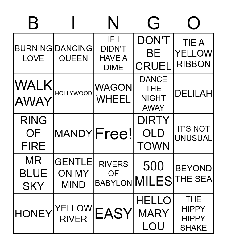 This bingo card has a free space and 45 words: PRETTY FLAMINGO, THE HIPPY HIPPY SHAKE, WALKIN BACK TO HAPPINESS, HONEY, BAD BAD LEROY BROWN, HELLO MARY LOU, IF I DIDN'T HAVE A DIME, YOU'RE SIXTEEN, TIE A YELLOW RIBBON, YELLOW RIVER, DON'T BE CRUEL, DIRTY OLD TOWN, RIVERS OF BABYLON, GENTLE ON MY MIND, COWARD OF THE COUNTY, EASY, GREASE, RING OF FIRE, FERRY CROSS THE MERSEY, DELILAH, DANCING QUEEN, THE ROSE, MOLLY MALONE, BURNING LOVE, 9 TO 5, IT'S NOT UNUSUAL, WHEN I NEED YOU, SHE BELIEVES IN ME, 500 MILES, MR BLUE SKY, ROSE GARDEN, BEYOND THE SEA, MY GIRL, THE YOUNG ONES, SOMETHING STUPID, MANDY, CROCODILE ROCK, MATRIMONY, PUPPY LOVE, WAGON WHEEL, WALK AWAY, DANCE THE NIGHT AWAY, SILVER LADY, HOLLYWOOD and SUNNY AFTERNOON.