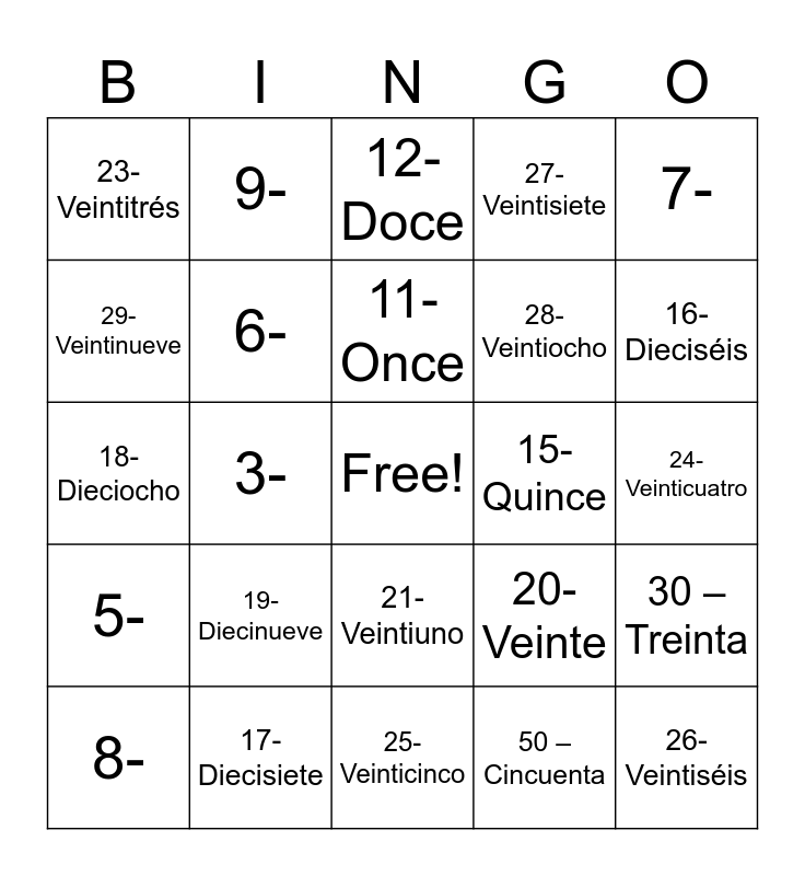 This bingo card has a free space and 33 words: 1-, 2-, 3-, 4-, 5-, 6-, 7-, 8-, 9-, 10- Diez, 11- Once, 12- Doce, 13- Trece, 14- Catorce, 15- Quince, 16- Dieciséis, 17- Diecisiete, 18- Dieciocho, 19- Diecinueve, 20- Veinte, 21- Veintiuno, 22- Veintidós, 23- Veintitrés, 24- Veinticuatro, 25- Veinticinco, 26- Veintiséis, 27- Veintisiete, 28- Veintiocho, 29- Veintinueve, 30 – Treinta, 40 – Cuarenta, 50 – Cincuenta and 60 – Sesenta.