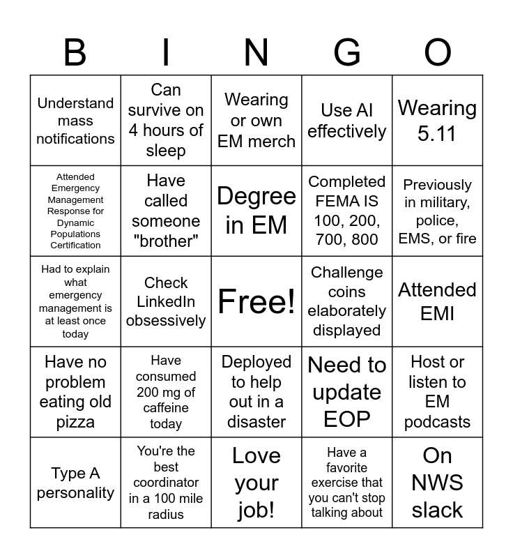 This bingo card has a free space and 24 words: Have consumed 200 mg of caffeine today, You're the best coordinator in a 100 mile radius, Degree in EM, Type A personality, Wearing 5.11, Understand mass notifications, Attended Emergency Management Response for Dynamic Populations Certification, Can survive on 4 hours of sleep, Challenge coins elaborately displayed, Deployed to help out in a disaster, Completed FEMA IS 100, 200, 700, 800, Had to explain what emergency management is at least once today, Need to update EOP, Host or listen to EM podcasts, Have called someone "brother", Have a favorite exercise that you can't stop talking about, Attended EMI, Wearing or own EM merch, Previously in military, police, EMS, or fire, Check LinkedIn obsessively, On NWS slack, Have no problem eating old pizza, Use AI effectively and Love your job!.