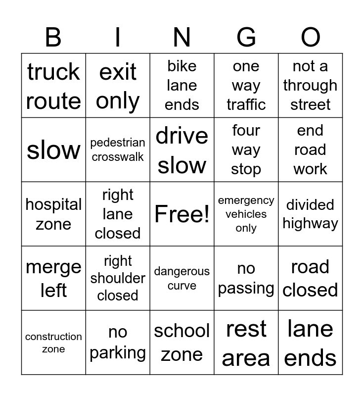 This bingo card has a free space and 24 words: right shoulder closed, no parking, drive slow, construction zone, not a through street, truck route, slow, exit only, emergency vehicles only, dangerous curve, four way stop, hospital zone, no passing, road closed, pedestrian crosswalk, rest area, divided highway, bike lane ends, end road work, right lane closed, lane ends, merge left, one way traffic and school zone.