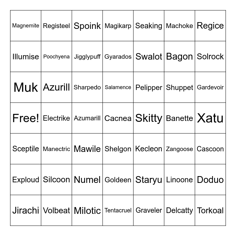 This bingo card has 199 words: Treecko, Grovyle, Sceptile, Torchic, Combusken, Blaziken, Mudkip, Marshtomp, Swampert, Poochyena, Mightyena, Zigzagoon, Linoone, Wurmple, Silcoon, Beautifly, Cascoon, Dustox, Lotad, Lombre, Ludicolo, Seedot, Nuzleaf, Shiftry, Free!, Taillow, Swellow, Wingull, Pelipper, Ralts, Kirlia, Gardevoir, Surskit, Masquerain, Shroomish, Breloom, Slakoth, Vigoroth, Slaking, Abra, Kadabra, Nincada, Ninjask, Shedinja, Whismur, Loudred, Exploud, Makuhita, Hariyama, Goldeen, Seaking, Magikarp, Gyarados, Azurill, Marill, Azumarill, Geodude, Graveler, Nosepass, Skitty, Delcatty, Zubat, Golbat, Crobat, Tentacool, Tentacruel, Sableye, Mawile, Aron, Lairon, Aggron, Machop, Machoke, Machamp, Meditite, Medicham, Electrike, Manectric, Plusle, Minun, Magnemite, Magneton, Voltorb, Electrode, Volbeat, Illumise, Oddish, Gloom, Vileplume, Bellossom, Doduo, Dodrio, Roselia, Gulpin, Swalot, Carvanha, Sharpedo, Wailmer, Wailord, Numel, Camerupt, Slugma, Magcargo, Torkoal, Grimer, Muk, Koffing, Weezing, Spoink, Grumpig, Sandshrew, Sandslash, Spinda, Skarmory, Trapinch, Vibrava, Flygon, Cacnea, Cacturne, Swablu, Altaria, Zangoose, Seviper, Lunatone, Solrock, Barboach, Whiscash, Corphish, Crawdaunt, Baltoy, Claydol, Lileep, Cradily, Anorith, Armaldo, Igglybuff, Jigglypuff, Feebas, Milotic, Castform, Staryu, Starmie, Kecleon, Shuppet, Banette, Duskull, Dusclops, Tropius, Chimecho, Absol, Vulpix, Ninetales, Pichu, Pikachu, Raichu, Psyduck, Golduck, Wynaut, Wobbuffet, Natu, Xatu, Girafarig, Phanpy, Donphan, Pinsir, Heracross, Rhyhorn, Rhydon, Snorunt, Glalie, Spheal, Sealeo, Walrein, Clamperl, Huntail, Gorebyss, Relicanth, Corsola, Chinchou, Luvdisc, Horsea, Seadra, Kingdra, Bagon, Shelgon, Salamence, Beldum, Metang, Metagross, Regirock, Regice, Registeel, Latias, latios, Kyogre, Groudon, Rayquaza, Jirachi and Deoxys.
