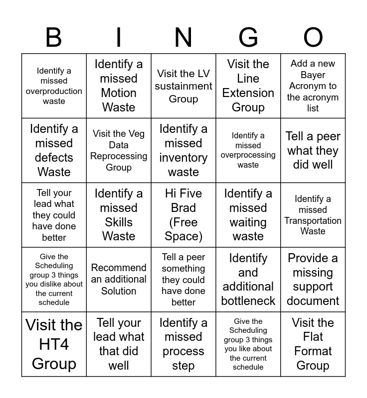 This bingo card has a free space and 24 words: Visit the HT4 Group, Recommend an additional Solution, Identify a missed inventory waste, Give the Scheduling group 3 things you like about the current schedule, Add a new Bayer Acronym to the acronym list, Identify a missed overproduction waste, Identify a missed Motion Waste, Visit the LV sustainment Group, Identify a missed waiting waste, Identify a missed Transportation Waste, Tell your lead what they could have done better, Visit the Veg Data Reprocessing Group, Identify and additional bottleneck, Provide a missing support document, Identify a missed defects Waste, Tell your lead what that did well, Identify a missed process step, Visit the Line Extension Group, Tell a peer what they did well, Give the Scheduling group 3 things you dislike about the current schedule, Identify a missed Skills Waste, Tell a peer something they could have done better, Identify a missed overprocessing waste and Visit the Flat Format Group.