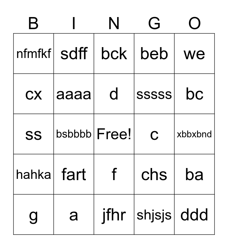 This bingo card has a free space and 24 words: fart, a, d, g, we, nfmfkf, cx, sdff, c, f, sssss, ss, chs, ba, aaaa, shjsjs, xbbxbnd, bck, bc, bsbbbb, ddd, hahka, beb and jfhr.