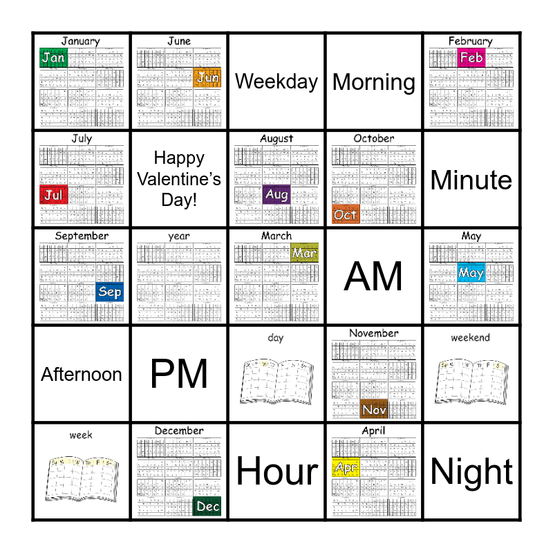 This bingo card has 15 images, a free space and 11 words: Evening, Morning, Afternoon, Weekday, Night, Minute, Hour, AM, PM, Happy Valentine’s Day! and free.