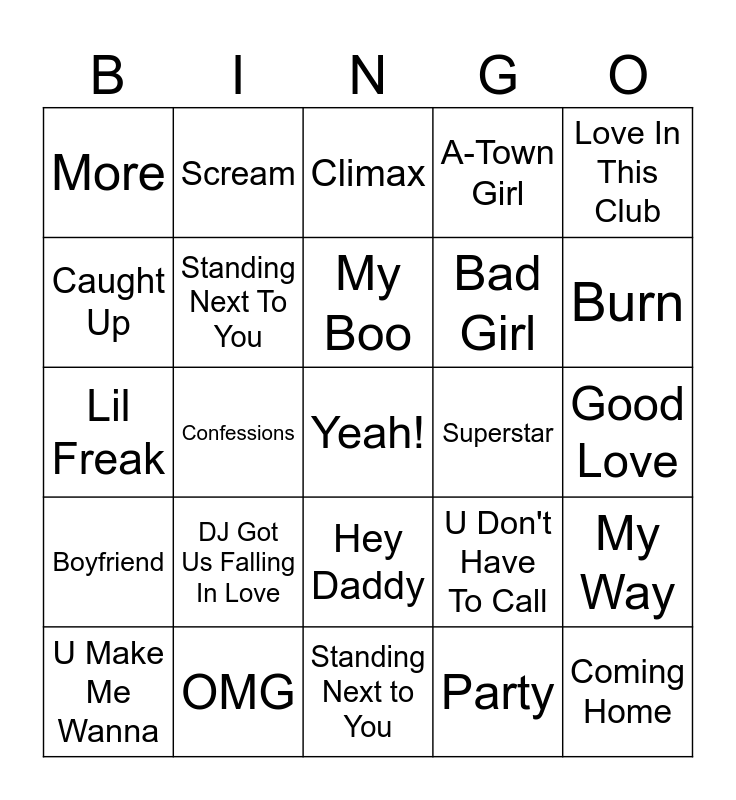 This bingo card has a free space and 24 words: DJ Got Us Falling In Love, OMG, My Boo, U Make Me Wanna, Love In This Club, More, Caught Up, Scream, Superstar, Hey Daddy, Bad Girl, Lil Freak, U Don't Have To Call, My Way, Standing Next To You, Party, Good Love, Climax, Burn, Confessions, Coming Home, Boyfriend, A-Town Girl and Standing Next to You.