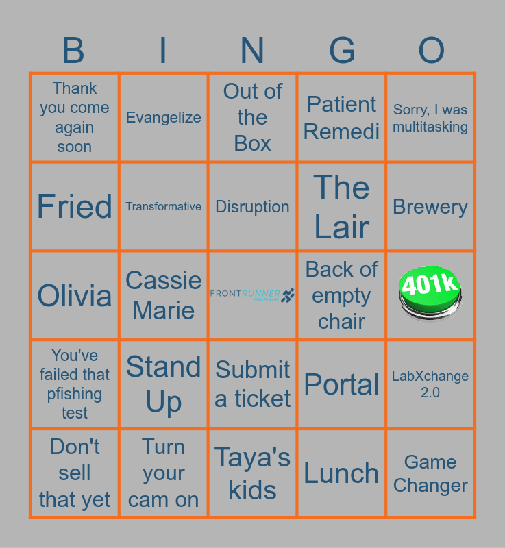 This bingo card has 2 images, a free space and 44 words: Deep Integration, Game Changer, Dev, Taya's kids, Stand Up, Uncle, Evangelize, #seaned, Fried, Profound, Transformative, Patient Remedi, LabXchange 2.0, Portal, WT...??, Ding Ding Ding, Disruption, Back of empty chair, I'm in the dead spot, Sorry, I was multitasking, Cassie Marie, Lunch, Thank you come again soon, The Lair, Don't go straight to Devs!, Brewery, Don't sell that yet, Follow the process, Submit a ticket, You've failed that pfishing test, Just reboot, No Bandwith, Batch, Have a steak, Can you recap that call?, Turn your cam on, Put it on Jason's list, LFG!!!, Use Case, Out of the Box, Olivia, OBDC, Float it and "We".