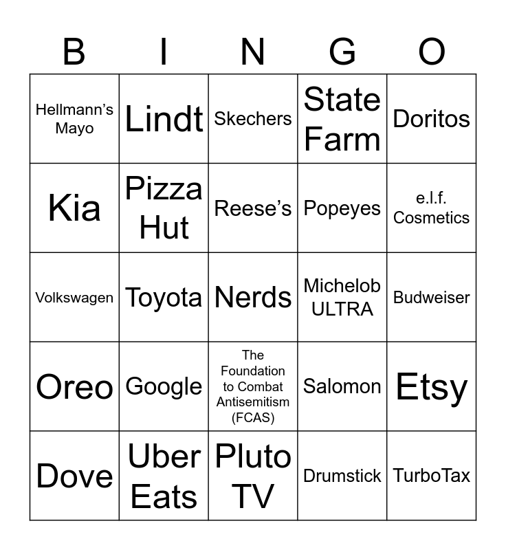 This bingo card has 49 words: Free!, Nerds, Pringles, Pluto TV, Google, FanDuel, Lindt, Coors Light, Kia, Squarespace, Pizza Hut, State Farm, Etsy, Salomon, Verizon, Microsoft, Reese’s, Michelob ULTRA, E*TRADE, Doritos, Toyota, Drumstick, Hellmann’s Mayo, Popeyes, M&M’S, e.l.f. Cosmetics, Dove, Paramount+, The Foundation to Combat Antisemitism (FCAS), Oreo, Booking.com, NYX Professional Makeup, United Airlines, Power to the Patients, Uber Eats, Frito-Lay, Bud Light, STōK Cold Brew Coffee, Budweiser, DoorDash, CrowdStrike, MTN DEW BAJA BLAST, TurboTax, BMW, Volkswagen, Skechers, Kawasaki, Bodyarmor and Starry.