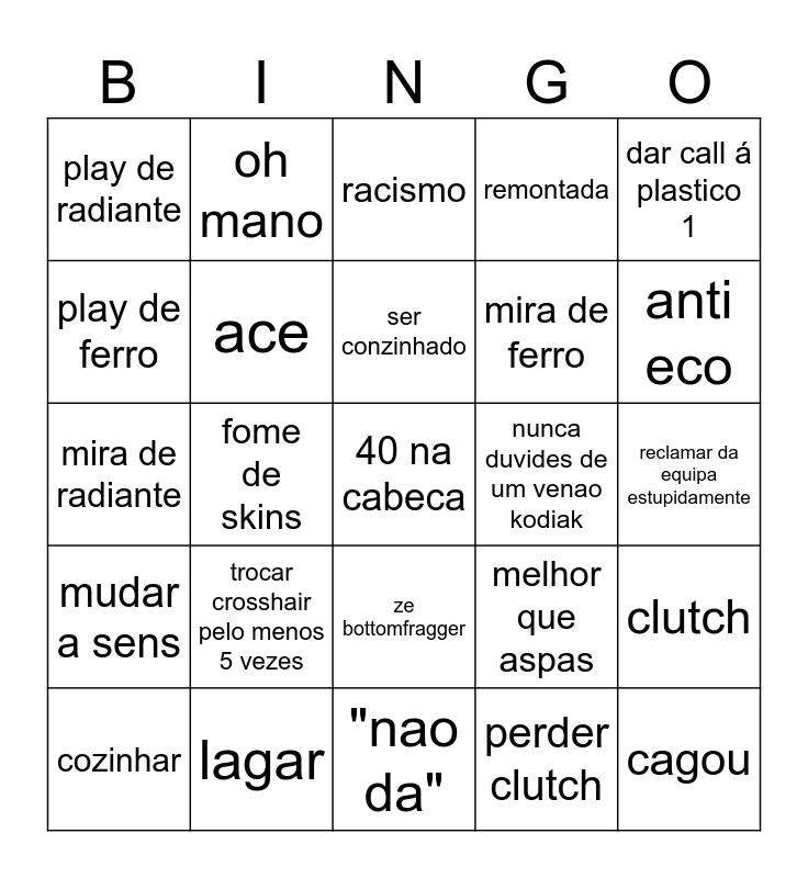 This bingo card has a free space and 24 words: trocar crosshair pelo menos 5 vezes, lagar, ser conzinhado, cozinhar, dar call á plastico 1, play de radiante, play de ferro, oh mano, nunca duvides de um venao kodiak, ze bottomfragger, mira de ferro, mira de radiante, melhor que aspas, clutch, ace, perder clutch, reclamar da equipa estupidamente, racismo, anti eco, fome de skins, cagou, mudar a sens, remontada and "nao da".