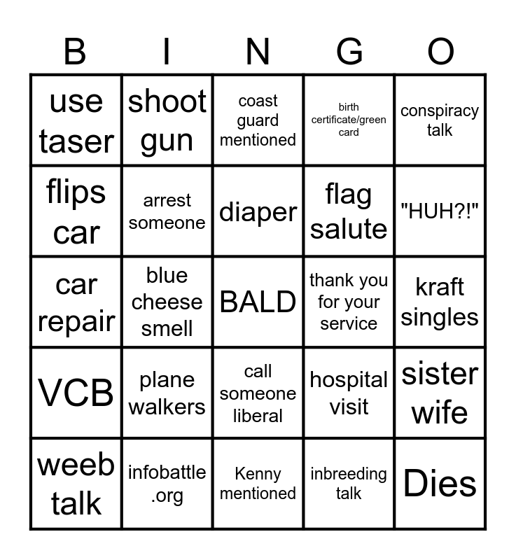 This bingo card has a free space and 24 words: plane walkers, infobattle .org, diaper, weeb talk, conspiracy talk, use taser, flips car, shoot gun, thank you for your service, call someone liberal, flag salute, car repair, hospital visit, sister wife, arrest someone, inbreeding talk, kraft singles, coast guard mentioned, "HUH?!", blue cheese smell, Dies, VCB, birth certificate/green card and Kenny mentioned.