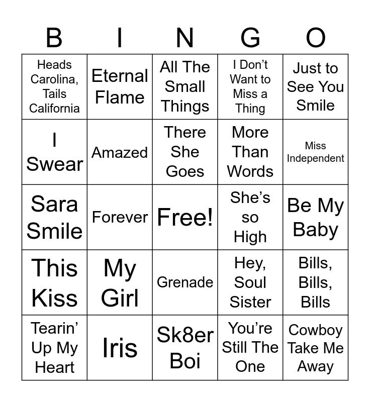 This bingo card has a free space and 59 words: Fantasy, Iris, I Want You to Want Me, This Kiss, You’re Still The One, Always Be My Baby, Amazed, I Want It That Way, More Than Words, When You Say Nothing At All, I Don’t Want to Miss a Thing, My Heart Will Go On, I Swear, Whatta Man, Wonderwall, Heads Carolina, Tails California, Cowboy Take Me Away, Just to See You Smile, Wannabe, There She Goes, She’s so High, All The Small Things, Tearin’ Up My Heart, Bills, Bills, Bills, Breakfast At Tiffany’s, …Baby One More Time, Halo, No One, Miss Independent, Drops of Jupiter, A Thousand Miles, Kiss Me, I Wanna Dance With Somebody, Faithfully, Eternal Flame, (I Just) Died in your Arms, Careless Whisper, Forever, Replay, Sara Smile, Can’t Take My Eyes Off You, My Girl, Be My Baby, Happy Together, (You Make Me Feel Like) A Natural Woman, This Magic Moment, You Make My Dreams Come True, Put Your Head On My Shoulder, Grenade, Sk8er Boi, Hey There Delilah, Fast Car, Ain’t No Sunshine, I Will Always Love You, Sweet Caroline, Hey, Soul Sister, Chasing Cars, Stand By Me and Walking On Sunshine.