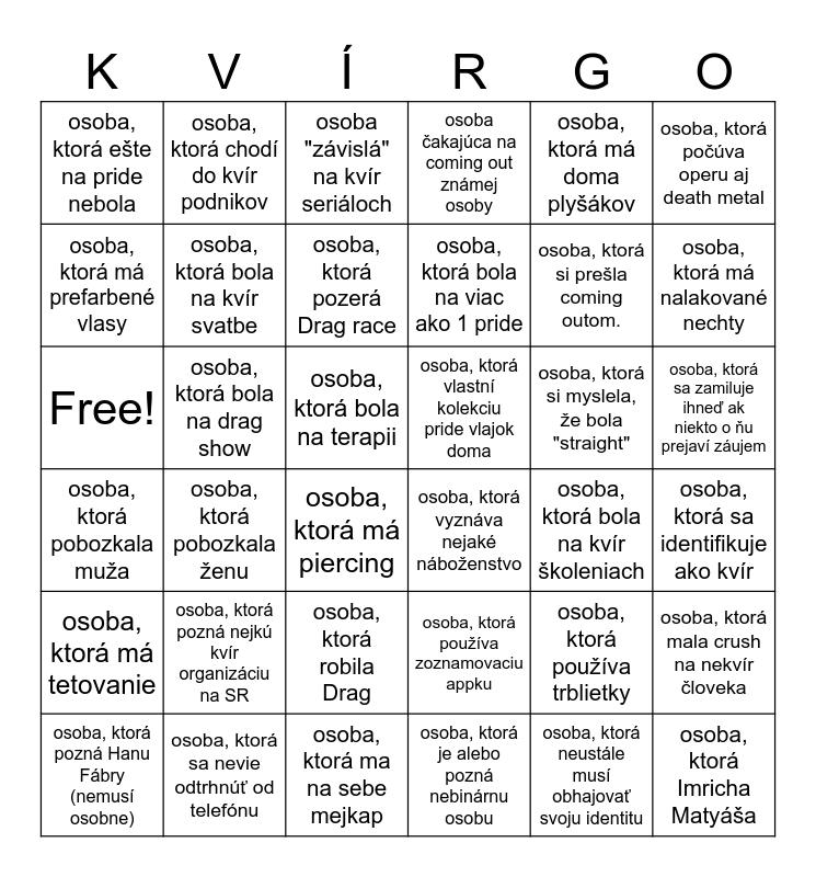 This bingo card has 36 words: osoba, ktorá používa zoznamovaciu appku, osoba, ktorá robila Drag, osoba, ktorá je alebo pozná nebinárnu osobu, osoba, ktorá má prefarbené vlasy, osoba, ktorá pobozkala muža, osoba, ktorá vlastní kolekciu pride vlajok doma, osoba, ktorá bola na kvír svatbe, osoba, ktorá ma na sebe mejkap, osoba, ktorá má doma plyšákov, osoba, ktorá používa trblietky, osoba, ktorá má nalakované nechty, osoba čakajúca na coming out známej osoby, osoba, ktorá mala crush na nekvír človeka, osoba, ktorá bola na drag show, osoba, ktorá bola na viac ako 1 pride, osoba, ktorá ešte na pride nebola, osoba, ktorá má tetovanie, osoba, ktorá si myslela, že bola "straight", Free!, osoba "závislá" na kvír seriáloch, osoba, ktorá bola na terapii, osoba, ktorá pobozkala ženu, osoba, ktorá vyznáva nejaké náboženstvo, osoba, ktorá má piercing, osoba, ktorá bola na kvír školeniach, osoba, ktorá chodí do kvír podnikov, osoba, ktorá si prešla coming outom., osoba, ktorá sa nevie odtrhnúť od telefónu, osoba, ktorá pozerá Drag race, osoba, ktorá počúva operu aj death metal, osoba, ktorá Imricha Matyáša, osoba, ktorá pozná Hanu Fábry (nemusí osobne), osoba, ktorá sa identifikuje ako kvír, osoba, ktorá sa zamiluje ihneď ak niekto o ňu prejaví záujem, osoba, ktorá pozná nejkú kvír organizáciu na SR and osoba, ktorá neustále musí obhajovať svoju identitu.