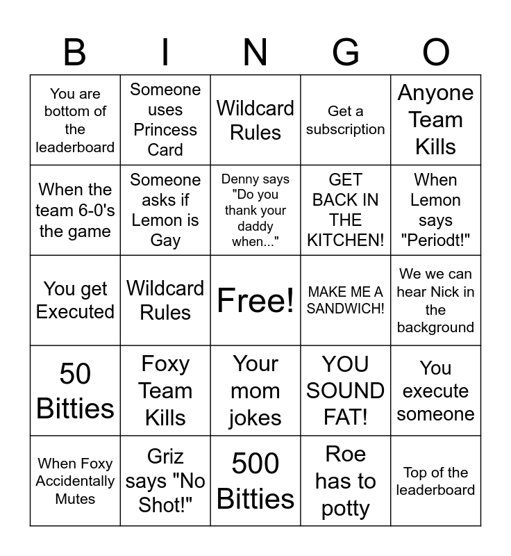 This bingo card has a free space and 24 words: Foxy Team Kills, Griz says "No Shot!", Denny says "Do you thank your daddy when...", When Foxy Accidentally Mutes, Anyone Team Kills, You are bottom of the leaderboard, When the team 6-0's the game, Someone uses Princess Card, MAKE ME A SANDWICH!, Your mom jokes, GET BACK IN THE KITCHEN!, You get Executed, YOU SOUND FAT!, You execute someone, Someone asks if Lemon is Gay, Roe has to potty, We we can hear Nick in the background, Wildcard Rules, When Lemon says "Periodt!", Wildcard Rules, Top of the leaderboard, 50 Bitties, Get a subscription and 500 Bitties.