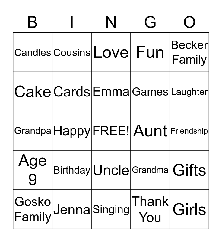 This bingo card has a free space and 24 words: Birthday, Jenna, Emma, Gosko Family, Becker Family, Candles, Cake, Cousins, Aunt, Uncle, Games, Grandpa, Grandma, Gifts, Cards, Thank You, Friendship, Love, Laughter, Happy, Girls, Age 9, Fun and Singing.