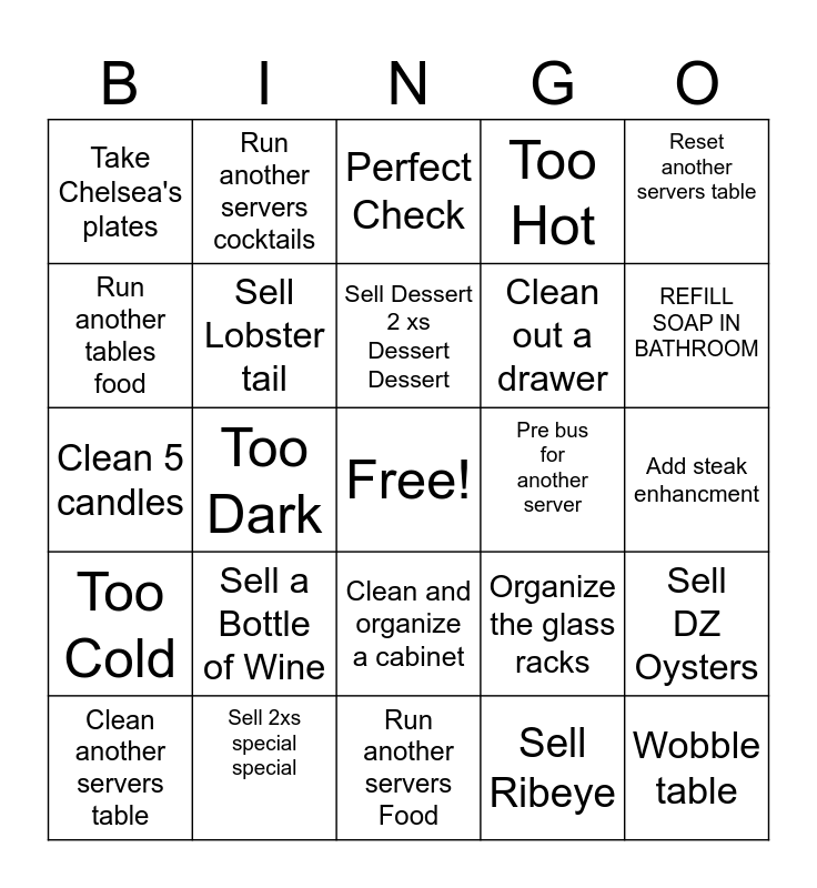 This bingo card has a free space and 24 words: Sell a Bottle of Wine, Sell 2xs special special, Sell Dessert 2 xs Dessert Dessert, Clean another servers table, Reset another servers table, Take Chelsea's plates, Run another tables food, Run another servers cocktails, Pre bus for another server, Clean and organize a cabinet, Clean out a drawer, Clean 5 candles, Organize the glass racks, Sell DZ Oysters, Sell Lobster tail, Sell Ribeye, Add steak enhancment, Perfect Check, REFILL SOAP IN BATHROOM, Too Dark, Wobble table, Too Cold, Too Hot and Run another servers Food.