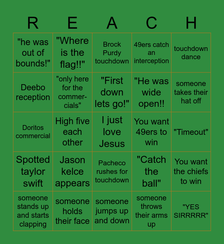 This bingo card has a free space and 29 words: someone stands up and starts clapping, someone gets mad at the refs, High five each other, Mahomes rushing touchdown, "he was out of bounds!", Brock Purdy touchdown, "only here for the commer-cials", Jason kelce appears, You want 49ers to win, someone holds their face, "Timeout", "YES SIRRRRR", someone jumps up and down, someone throws their arms up, someone takes their hat off, chiefs fumbles, Pacheco rushes for touchdown, Spotted taylor swift, touchdown dance, Doritos commercial, "Catch the ball", someone paces around the back, "He was wide open!!, Deebo reception, 49ers catch an interception, "Where is the flag!!", You want the chiefs to win, "First down lets go!" and someone watches standing while hands are on their knees.
