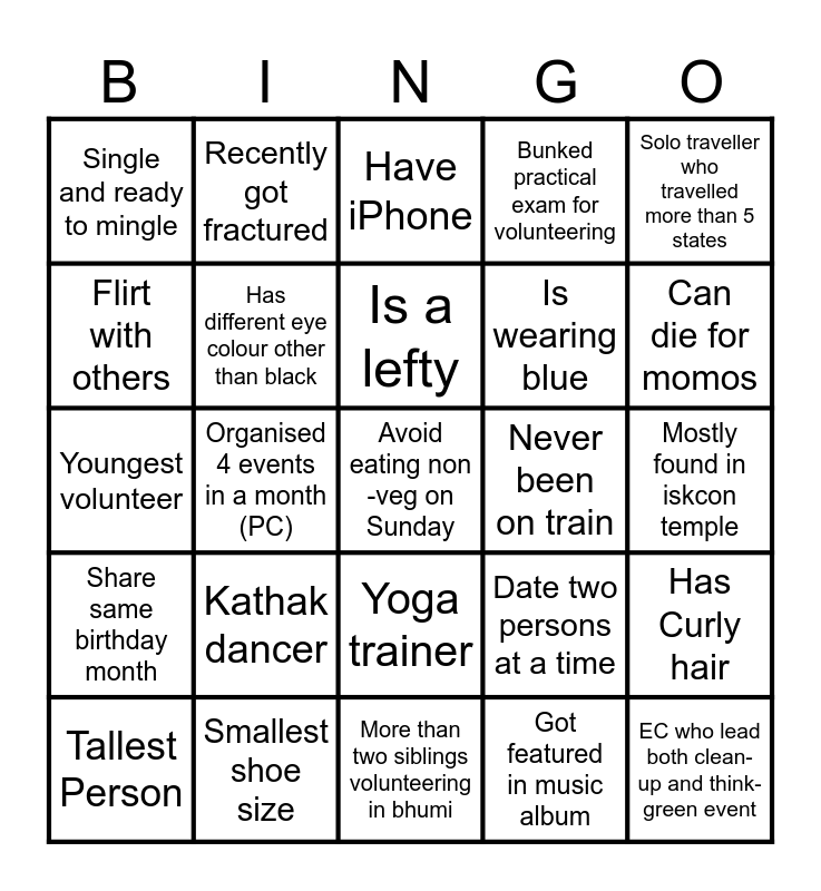 This bingo card has a free space and 24 words: Tallest Person, Kathak dancer, Is a lefty, Got featured in music album, Solo traveller who travelled more than 5 states, Single and ready to mingle, Recently got fractured, Have iPhone, Never been on train, Mostly found in iskcon temple, Youngest volunteer, Has different eye colour other than black, Date two persons at a time, Has Curly hair, Flirt with others, Smallest shoe size, More than two siblings volunteering in bhumi, Bunked practical exam for volunteering, Can die for momos, Share same birthday month, Organised 4 events in a month (PC), Yoga trainer, Is wearing blue and EC who lead both clean-up and think-green event.