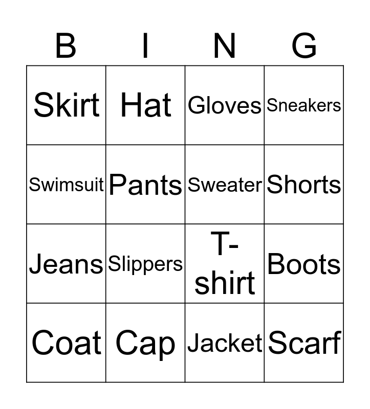 This bingo card has a free space and 15 words: Coat, Scarf, Gloves, Skirt, Shorts, Swimsuit, Slippers, Jacket, Pants, Jeans, Boots, Sneakers, Sweater, Hat and Cap.