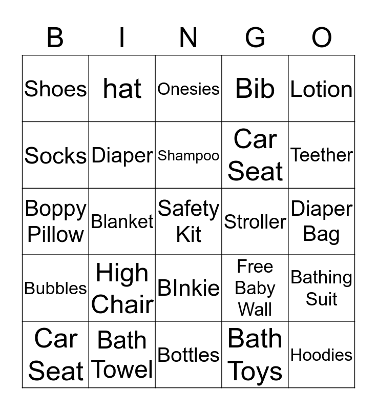 This bingo card has 25 words: High Chair, Bottles, Shampoo, Car Seat, Lotion, Shoes, Socks, hat, Stroller, BInkie, Car Seat, Boppy Pillow, Free Baby Wall, Bathing Suit, Diaper, Hoodies, Diaper Bag, Onesies, Teether, Blanket, Safety Kit, Bath Towel, Bubbles, Bib and Bath Toys.