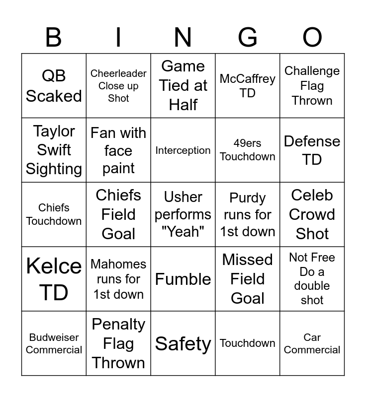 This bingo card has 26 words: Fumble, Touchdown, Interception, Penalty Flag Thrown, Challenge Flag Thrown, QB Scaked, Taylor Swift Sighting, Cheerleader Close up Shot, Celeb Crowd Shot, Missed Field Goal, 49ers Touchdown, Chiefs Touchdown, Not Free Do a double shot, Budweiser Commercial, Chiefs Field Goal, 49ers Field Goal, McCaffrey TD, Kelce TD, Game Tied at Half, Usher performs "Yeah", Defense TD, Safety, Purdy runs for 1st down, Mahomes runs for 1st down, Fan with face paint and Car Commercial.