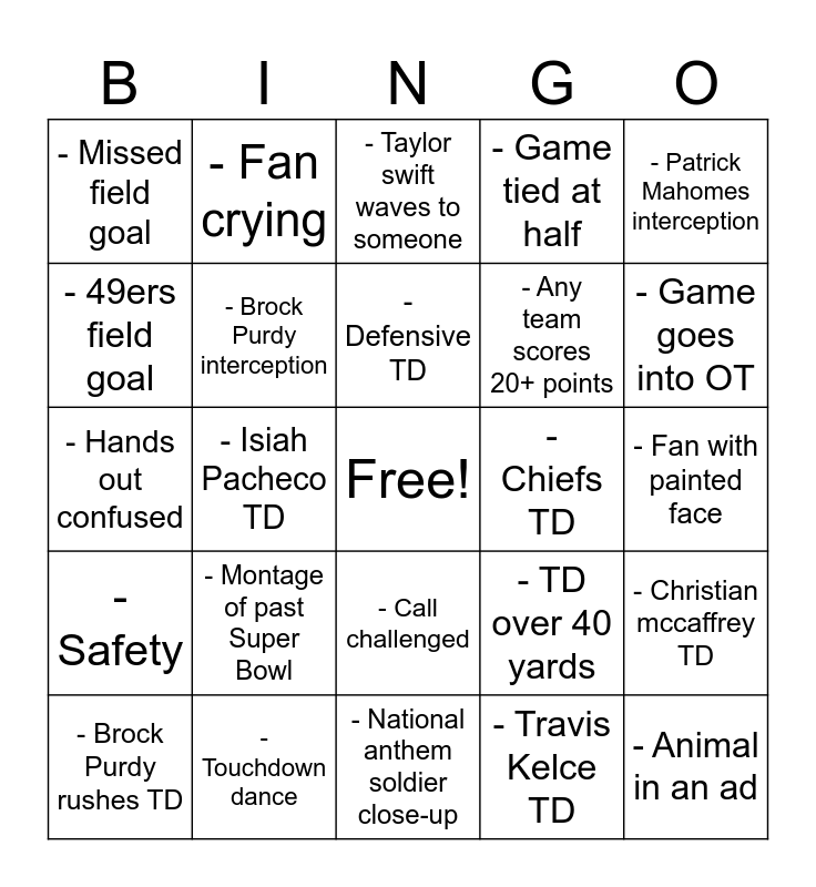 This bingo card has a free space and 47 words: - 2 point conversion, - Animal in an ad, - Field goal longer than 45 yards, - National anthem soldier close-up, - Montage of past Super Bowl, - Paul Rudd sighting, - Fan crying, - 49ers TD, - 49ers field goal, - QB sack, - Brock Purdy interception, - Game tied at half, - Christian mccaffrey TD, - TD over 40 yards, - Any team goes for it on 4th down, - Deebo Samuel TD, - Defensive TD, - Chiefs TD, - Chiefs field goal, - Patrick Mahomes interception, - Isiah Pacheco TD, - Travis Kelce TD, - Missed field goal, - Any team scores 20+ points, - End zone celebration, - Game goes into OT, - Brock Purdy rushes TD, - Patrick Mahomes rushes TD, - Call challenged, - Safety, - Crunch of potato chip, - Puppy in commercial, - A players mother, - Celebrity in a car Ad, - Cheers with beers, - Touchdown dance, - Fan with painted face, - Heads on coin toss, - Tails on coin toss, - Player crying, - Jason Kielce appearance, - Taylor swift waves to someone, - Hands out confused, - Stands up in anger, - Kick off returned for TD, - Player praying and - Dutch compares Super Bowl to AFL.