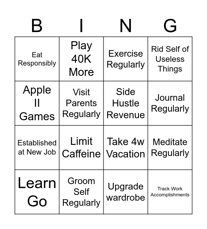 This bingo card has 16 words: Groom Self Regularly, Meditate Regularly, Exercise Regularly, Eat Responsibly, Established at New Job, Play 40K More, Take 4w Vacation, Upgrade wardrobe, Apple II Games, Visit Parents Regularly, Learn Go, Rid Self of Useless Things, Limit Caffeine, Journal Regularly, Side Hustle Revenue and Track Work Accomplishments.