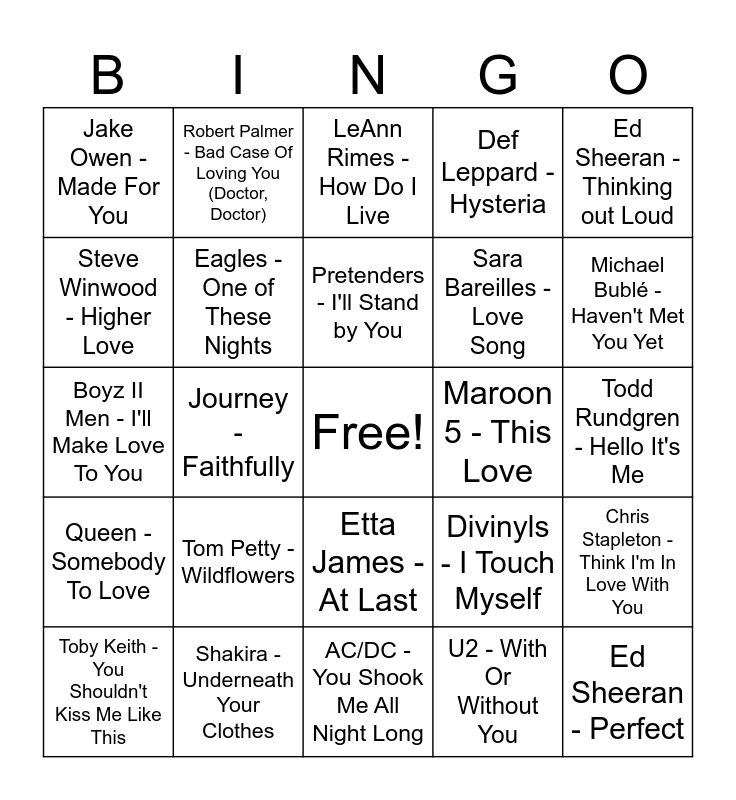 This bingo card has a free space and 26 words: Etta James - At Last, U2 - With Or Without You, Pretenders - I'll Stand by You, Shakira - Underneath Your Clothes, Ed Sheeran - Thinking out Loud, Jake Owen - Made For You, Steve Winwood - Higher Love, Robert Palmer - Bad Case Of Loving You (Doctor, Doctor), Todd Rundgren - Hello It's Me, Divinyls - I Touch Myself, Sara Bareilles - Love Song, Boyz II Men - I'll Make Love To You, Chris Stapleton - Think I'm In Love With You, Toby Keith - You Shouldn't Kiss Me Like This, Journey - Faithfully, Elton John - Something About The Way You Look Tonight, Def Leppard - Hysteria, Queen - Somebody To Love, LeAnn Rimes - How Do I Live, Ed Sheeran - Perfect, Michael Bublé - Haven't Met You Yet, AC/DC - You Shook Me All Night Long, Maroon 5 - This Love, Tom Petty - Wildflowers, Eagles - One of These Nights and Bee Gees - How Deep Is Your Love.