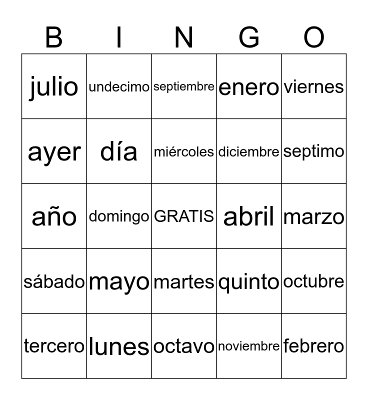 This bingo card has a free space and 40 words: fin de semana, año, mes, día, lunes, martes, miércoles, jueves, viernes, sábado, domingo, enero, febrero, marzo, abril, mayo, junio, julio, agosto, septiembre, octubre, noviembre, diciembre, ayer, anteayer, mañana, hoy, todos los días, semana, primero, Segundo, tercero, cuarto, quinto, septimo, octavo, noveno, decimo, undecimo and duodecimo.