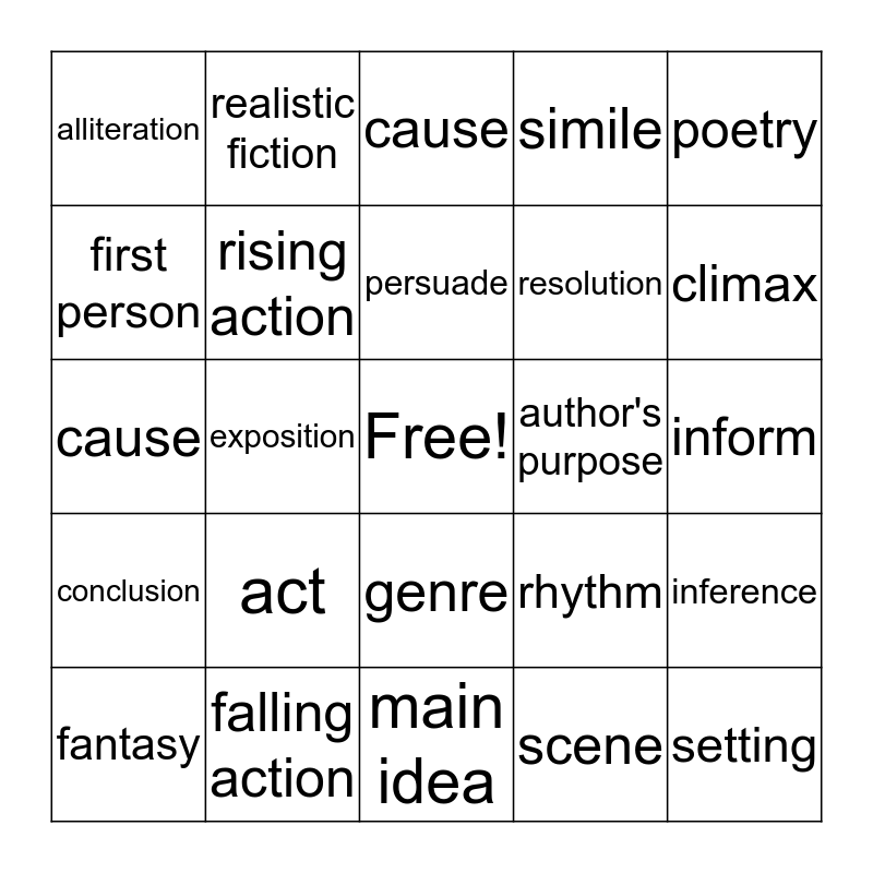 This bingo card has a free space and 24 words: act, falling action, persuade, fantasy, poetry, alliteration, first person, realistic fiction, author's purpose, genre, resolution, cause, rhythm, inference, rising action, scene, inform, cause, climax, exposition, setting, conclusion, simile and main idea.